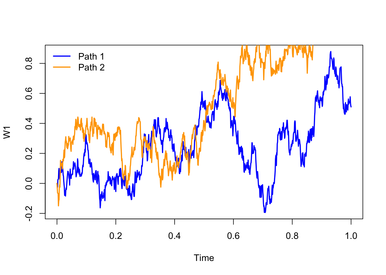 The following image shows two sample paths of a Wiener process. The paths were obtained by numerical simulation, considering independent increments that are normally distributed with zero mean and variance proportional to the time increment.
